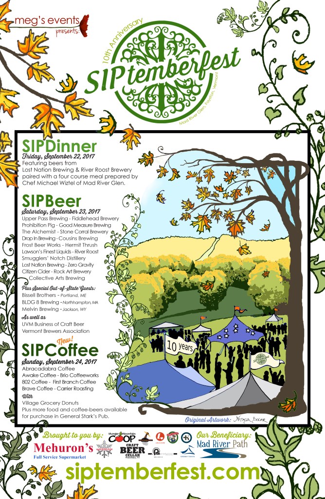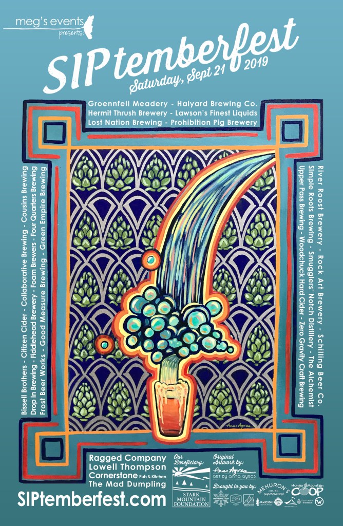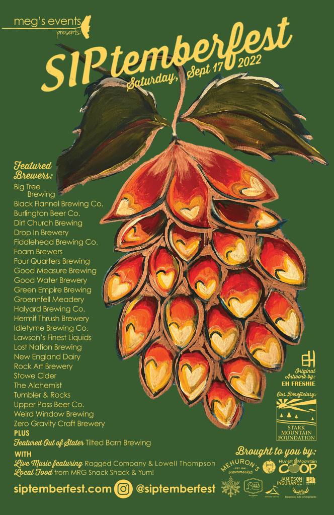 In 2013, SIPtemberfest started partnering with a new Vermont artist each year to create truly unique artwork for our posters. See below for a gallery of past artwork and stay tuned for our 2025 design!